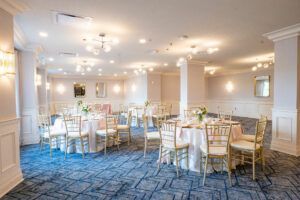 The Grand Ballroom is a perfect blend of versatility and luxury, including 4 vintage chandeliers that are paired with modern details. This room can be arranged to any preference. The tables are adorned with white linen tablecloths and cushioned banquet chairs to create an immaculate experience.